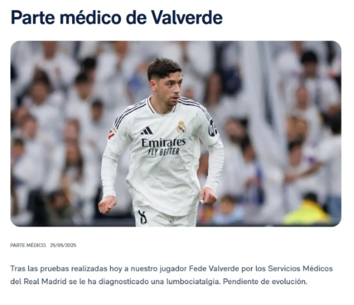 "Tras las pruebas realizadas hoy a nuestro jugador Fede Valverde por los Servicios Médicos del Real Madrid se le ha diagnosticado una lumbociatalgia. Pendiente de evolución", señaló el escrito.