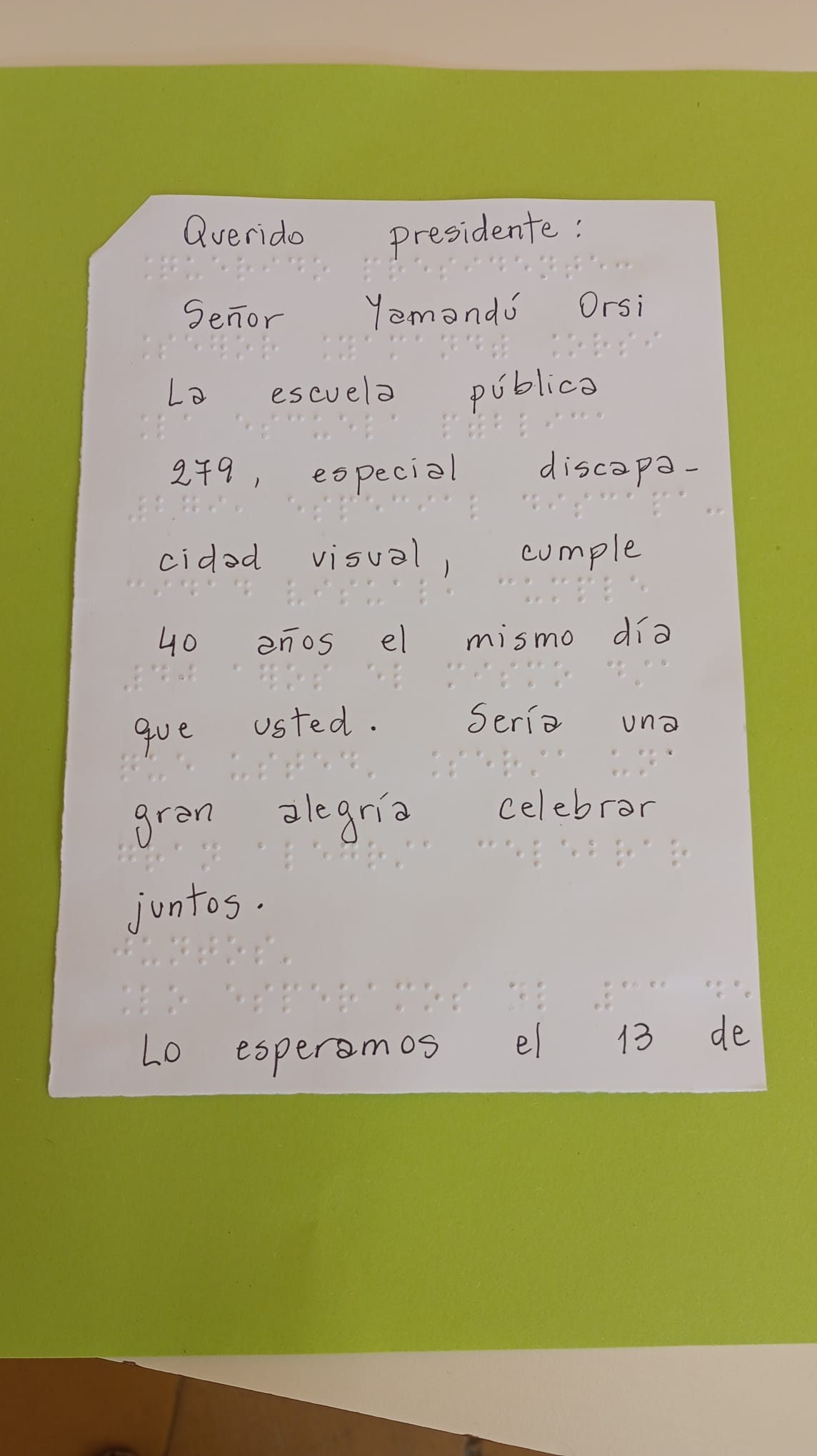 "Señor Yamandú Orsi, la escuela pública 279, especial discapacidad visual, cumple 40 años el mismo día que usted. Sería una gran alegría celebrar juntos. Lo esperamos", se leía en la misiva, que también estaba escrita en braille.