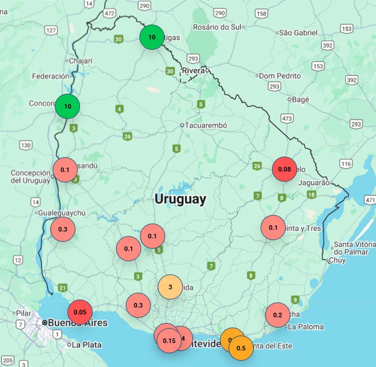Según registros oficiales, la niebla que cubre casi todo el país (salvo el extremo norte) reduce la visibilidad al mínimo y es necesario extremar los cuidados en la circulación por calles y rutas, especialmente en el sur, Montevideo y la zona metropolitana.