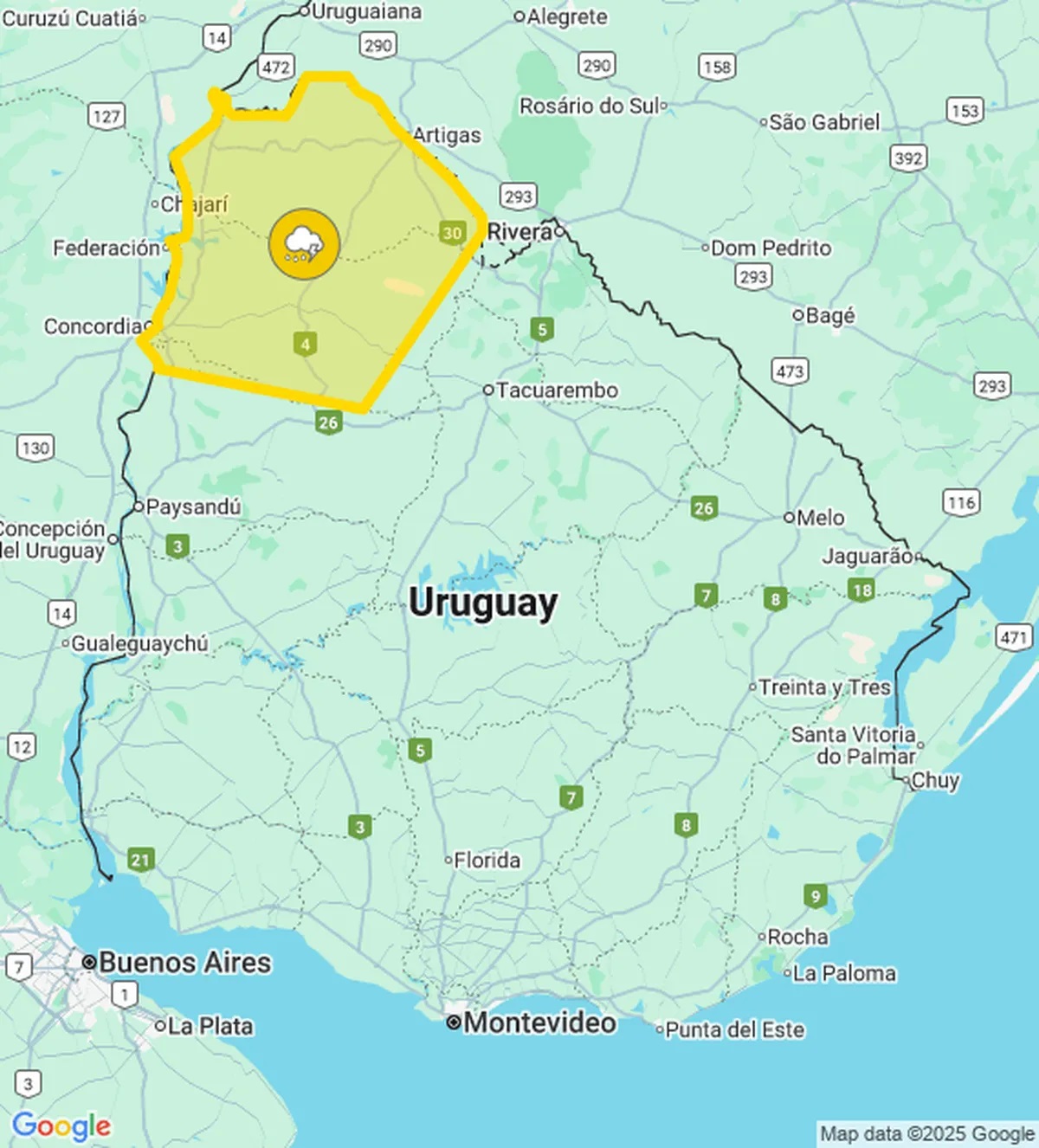 El Instituto Uruguayo de Meteorología (Inumet) emitió en la mañana de este domingo una advertencia amarilla para localidades del norte del país.