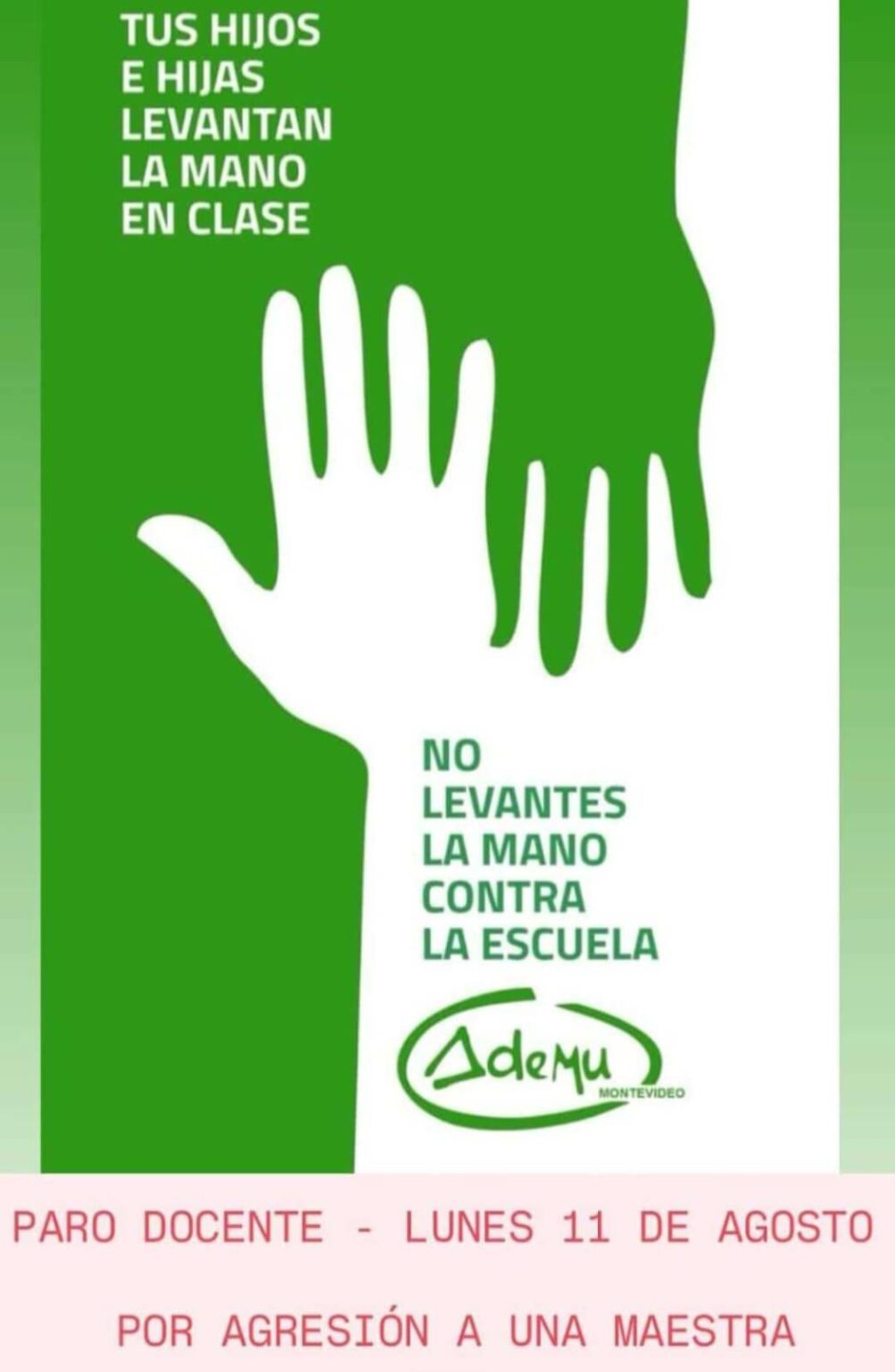 La filial de Montevideo de la Asociación de Maestros de Uruguay (Ademu) decidió para este lunes en todas las escuelas de la capital tras la agresión a una docente.