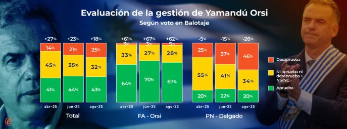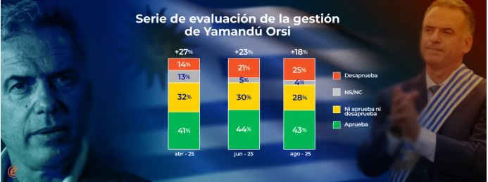 La evaluación del desempeño del presidente Yamandú Orsi mantiene un saldo positivo de +18. Aunque disminuye levemente respecto a la medición anterior, el saldo continúa siendo favorable. Desde que se inició el gobierno se aprecia una estabilidad global en los niveles de aprobación, y un progresivo aumento en los niveles de desaprobación. Los juicios intermedios, que habían sido muy altos en términos comparados al inicio de la gestión, parecen tender a normalizarse, según la encuesta de Equipos Consultores.