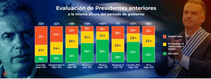 Los datos actuales de Orsi están por debajo de los que tenían Vázquez (2005), Mujica (2010) y Lacalle Pou (2020), y superan claramente los de Lacalle Herrera (1990), Sanguinetti (1995) y Vázquez (2015). Son muy similares a los que tenía Jorge Batlle en agosto del 2000, aunque este luego caería pronunciadamente en los últimos meses del año.