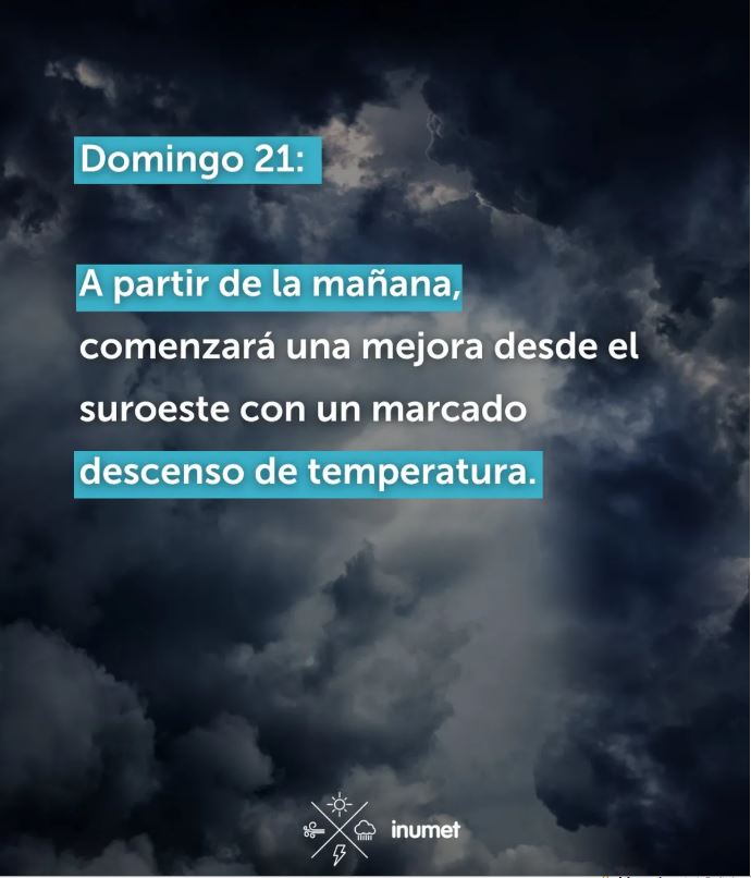 El domingo a partir de la mañana, comenzará una mejora desde el suroeste con un marcado descenso de temperatura.