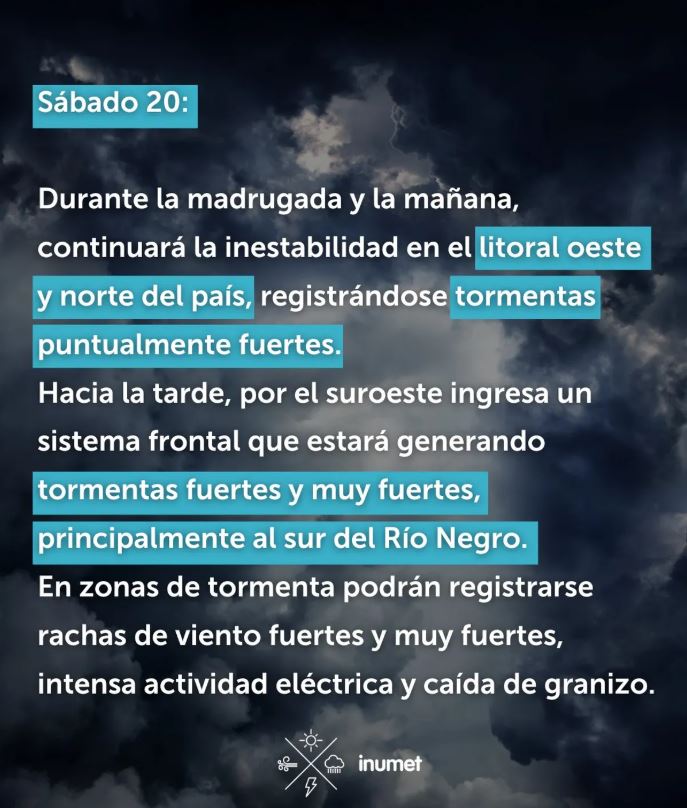 La inestabilidad continuará el sábado 20 durante la madrugada y la mañana, por el litoral oeste y norte del país, registrándose tormentas puntualmente fuertes.