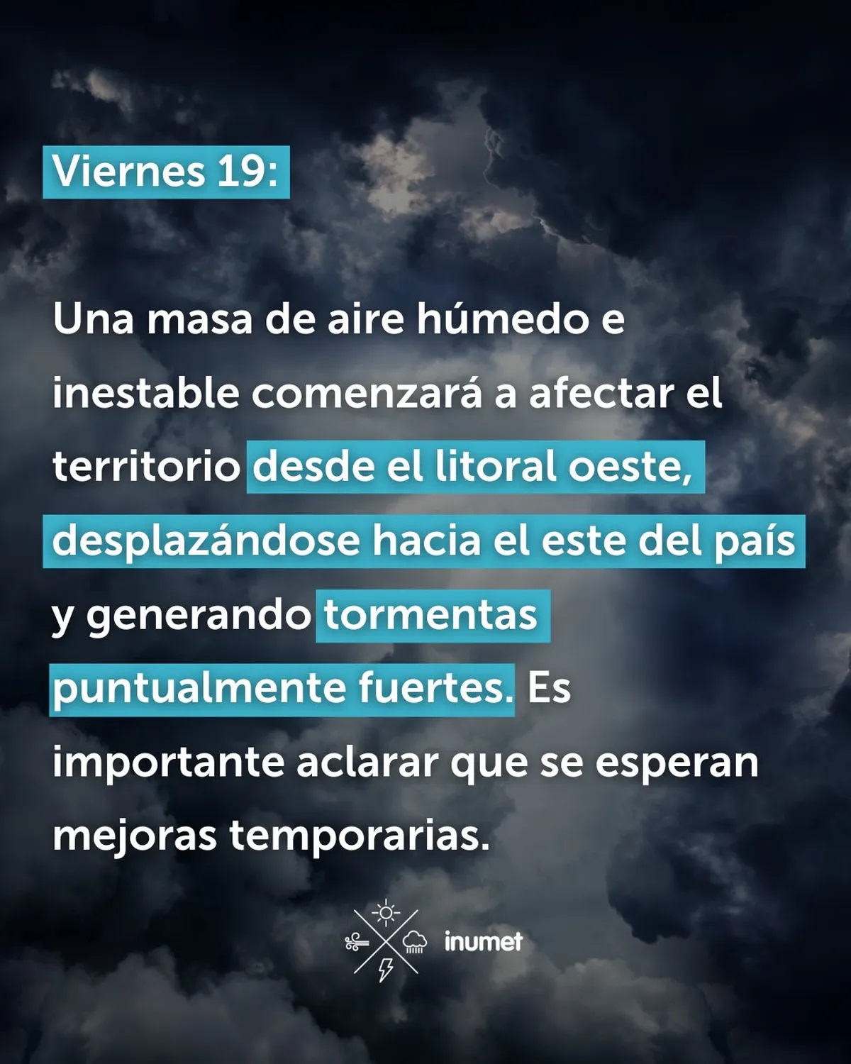 Una masa de aire húmedo e inestable comienza a afectar el territorio desde el litoral oeste, desplazándose hacia el este del país, generando tormentas puntualmente fuertes. "Es importante aclarar que se esperan mejoras temporarias", indica el comunicado.