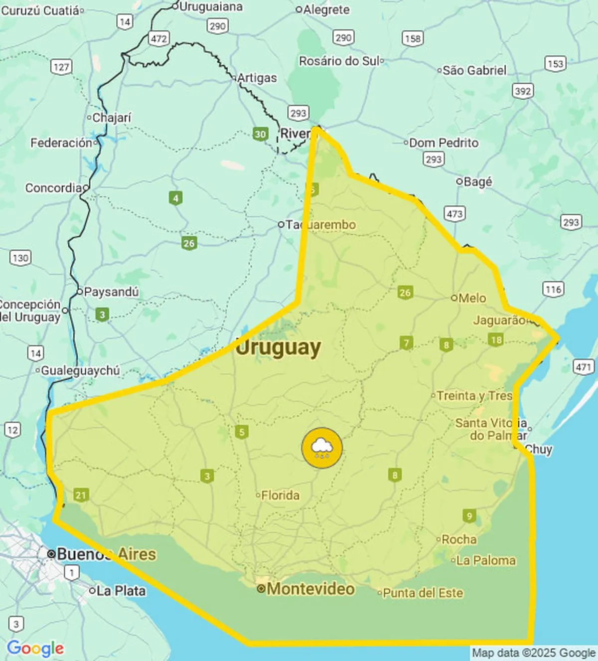 Desde la hora 9 de este sábado rige para gran parte del país una advertencia amarilla por la persistencia de lluvias abundantes, que solo exceptúa al norte y noreste, (ver mapa).