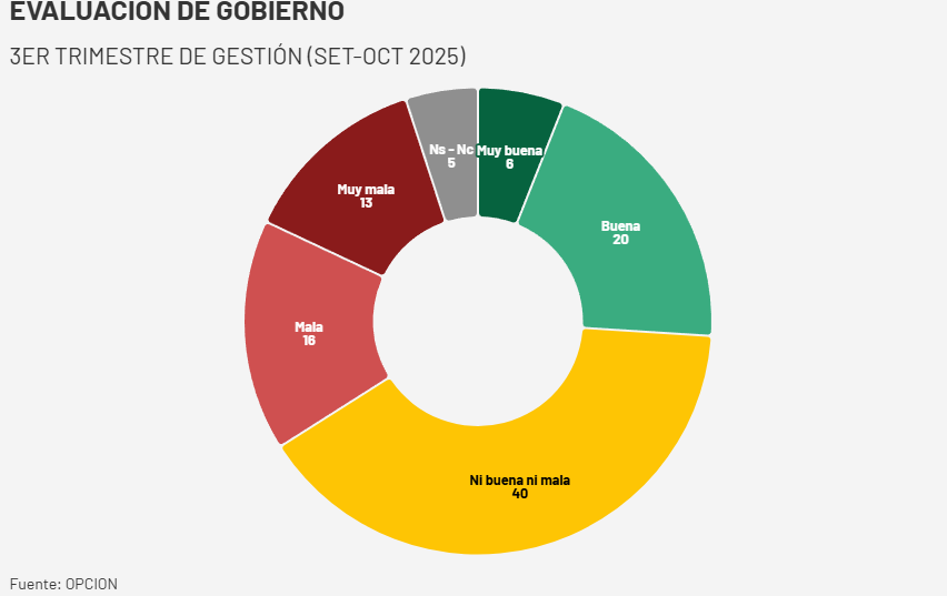 Un 40% de los encuestados respondió “Ni buena ni mala” acerca de cómo evalúa la gestión del gobierno, mientras que el 20% la calificó como “Buena” y 16% como “Mala”. En los extremos, el 13% dijo “Muy mala” y el 6% “Muy buena”. El resto de respuestas cayeron en la categoría “No sabe/No contesta”.