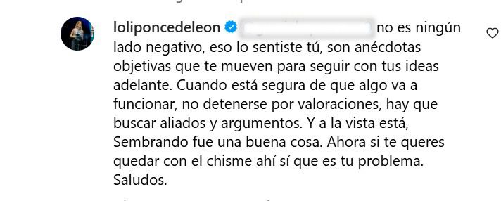 Entre los cientos de comentarios que tiene la publicación, Ponce de León decidió responder a ese y aseguró que “no es ningún lado negativo”, sino que son “anécdotas objetivas que te mueven para seguir con tus ideas adelante”.