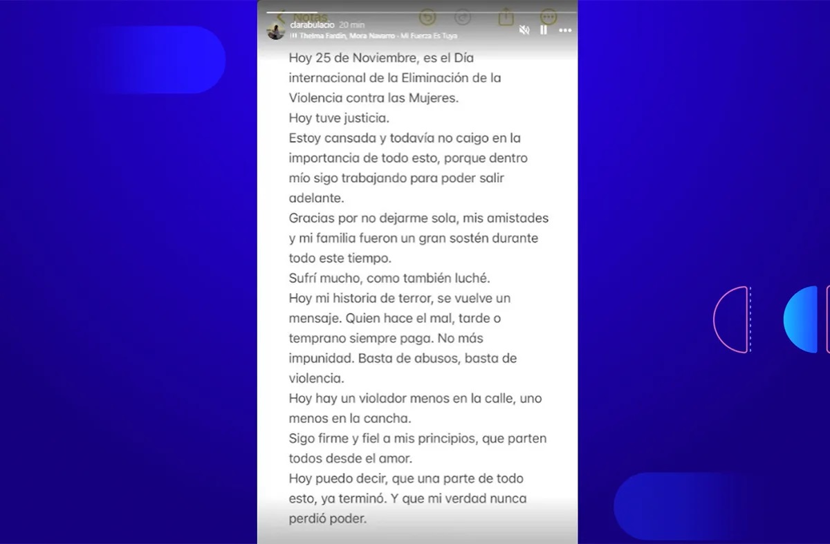 Clara Bulacio publicó un mensaje tras la condena del jugador de Peñarol. "Hoy mi historia de terror, se vuelve un mensaje. Quien hace el mal, tarde o temprano siempre paga. No más impunidad. Basta de abusos, basta de violencia".