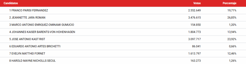 Detrás de Jara y Kast se ubicó sorpresivamente Franco Parisi, un economista de derecha del Partido de la Gente, tildado de populista. De 58 años, superó al ultraliberal Johannes Kaiser, a quien las encuestas ubicaban tercero.