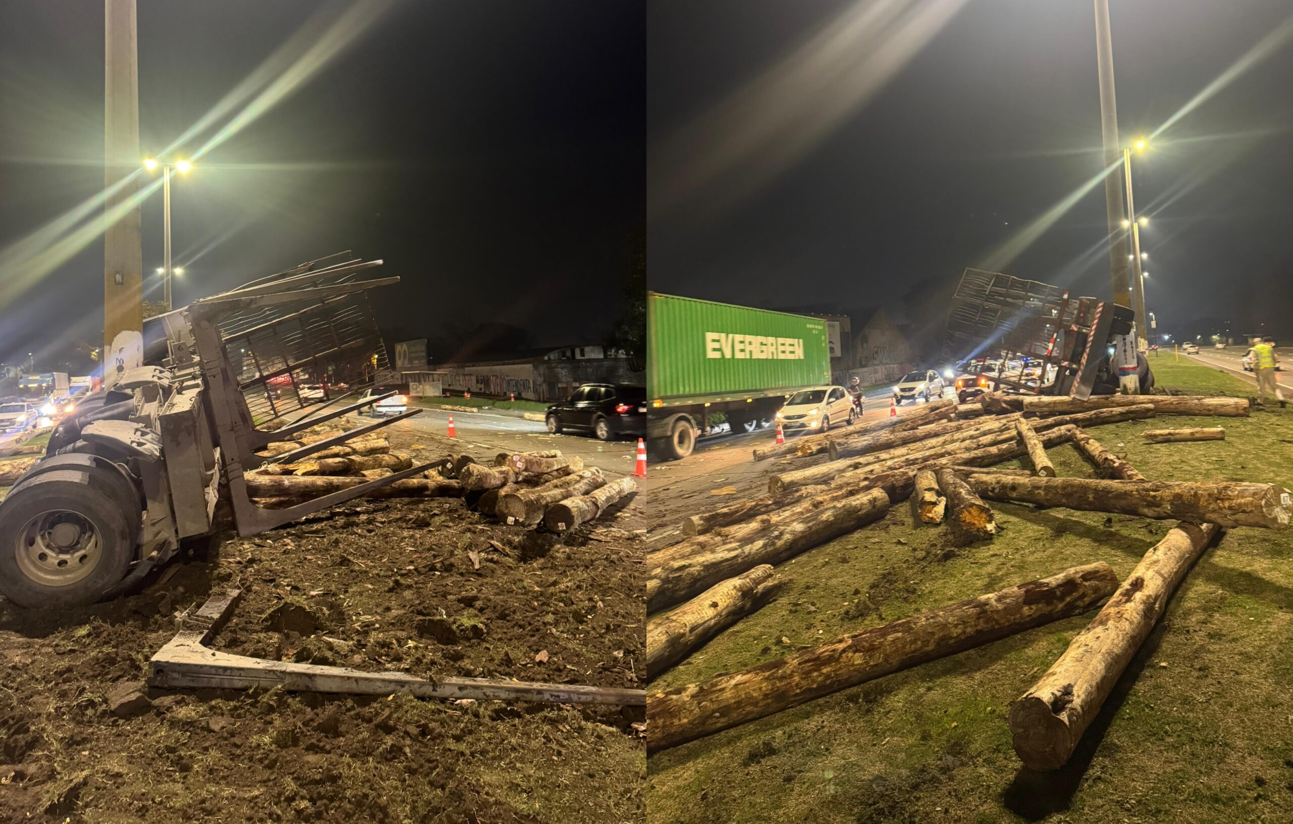 Camión que transportaba troncos perdió su acople en los accesos a Montevideo; la carga cayó sobre el cantero y la ruta