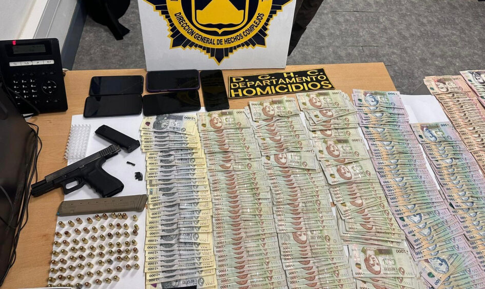 Entre los objetos incautados se encuentran una pistola, dos cargadores con 17 cartuchos, un cargador extensible, 41 municiones, una caja de pistola Glock, cinco teléfonos celulares y $299.970 en efectivo.