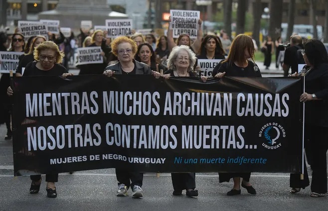 La convocatoria de Mujeres de Negro, Vía 8M y otros colectivos feministas comenzó en la plaza Independencia y finalizó en la explanada de la Universidad de la República con la lectura de la proclama.
