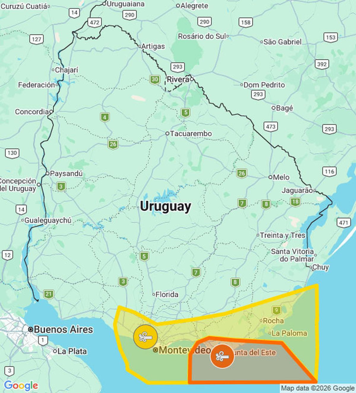La advertencia naranja es por vientos muy fuertes y rige para la costa de Maldonado. La advertencia amarilla es por vientos fuertes y persistentes para la costa, desde San José hasta Rocha.